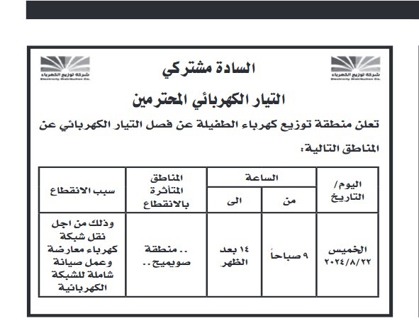 كما واعلنت شركة توزيع كهرباء الطفيلة عن نيتها فصل التيار الكهربائي عن المناطق المكتوبة ادناة