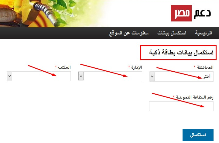 - نقوم في إدخال البيانات ، اسم المحافظة، الادارة والمكتب والتاجر ورقم بطاقة التموين.