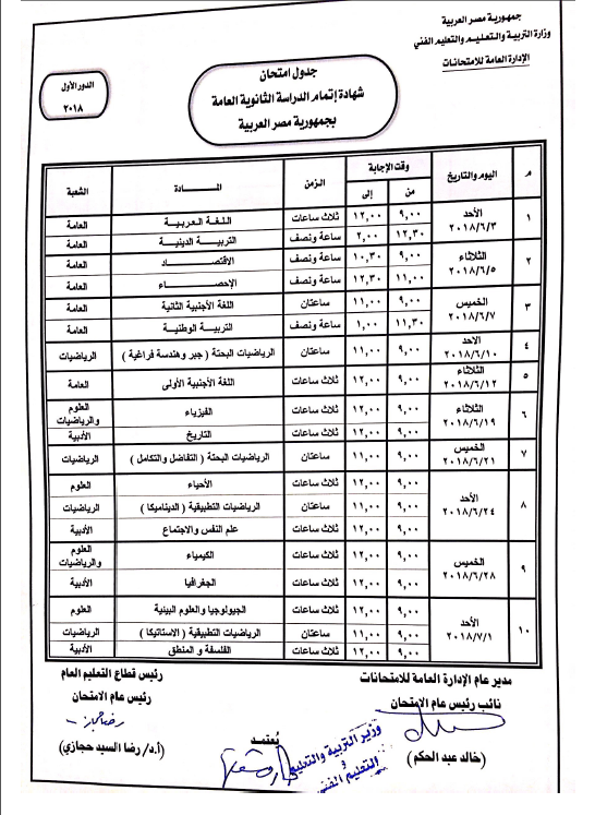 جدول أمتحان الثانوية العامة في مصر لعام 2018.