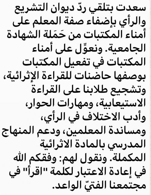 عبّر الدكتور عمر الرزاز وزير التربية والتعليم الاردني، عن سعادته حيال ردّ ديوان التشريع والرأي على موقع التواصل الإجتماعي بتغريدة له على تويتر ، بإضفاء صفة المتعلم على أمناء المكتبات من حملة الشهادة الجامعية.