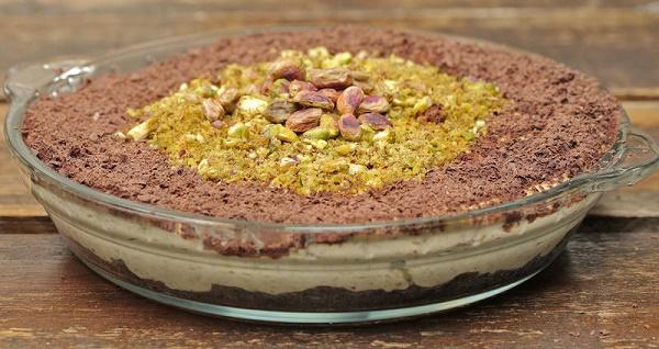 6- أخرجي الصينية من الثلاجة وزينيها بالفستق الحلبي المطحون خشناً والشوكولاتة المبشورة ثم قدميها بارة.