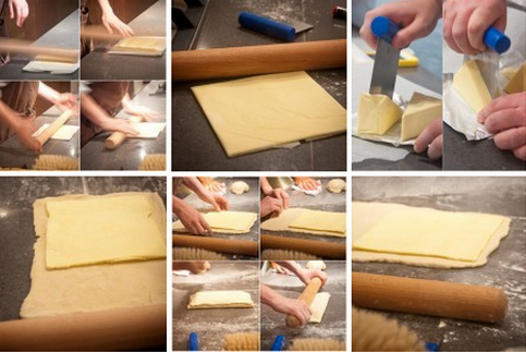 - ضعي قطع الزبدة الموجودة معك فوق كل قطعة عجين، قومي بفردها ثمّ إضغطي على العجين بالنشابة .