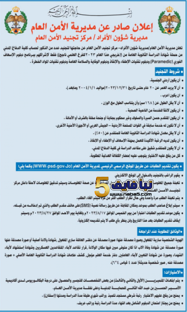 أصدرت مديرية الأمن العام / مديرية شؤون الأفراد – مركز تجنيد الأمن العام ، إعلاناً رسمياً ، اليوم الخميس ، بشأن بدء التجنيد لحملة التوجيهي.