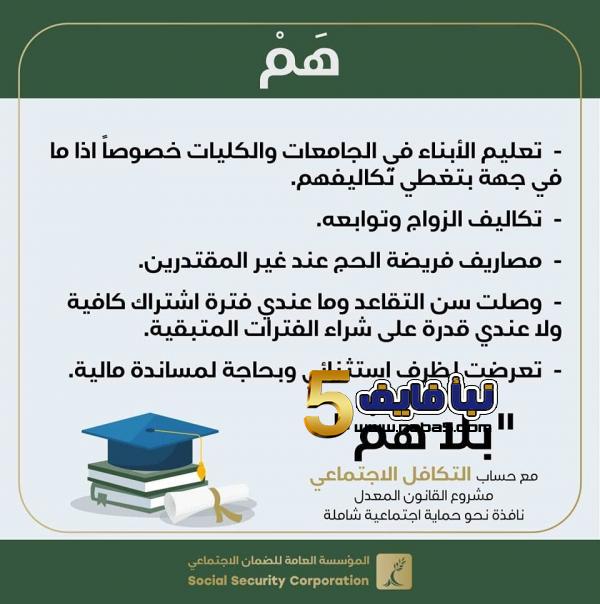وتحدثت مؤسسة الضمان الاجتماعي عبر موقع الاجتماعي وصفحتنا على الفيسبوك، إن حساب التكافل الاجتماعي يتضمن تعليم الأبناء في الكليات والجامعات خصيصا من جهة تكاليفهم.