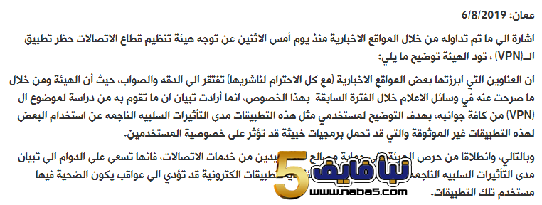 اعلنت هيئة الاتصالات الاردنية اليوم عن بيان هام حول التطبيقات الإفتراضية الخاصة (vpn)،
