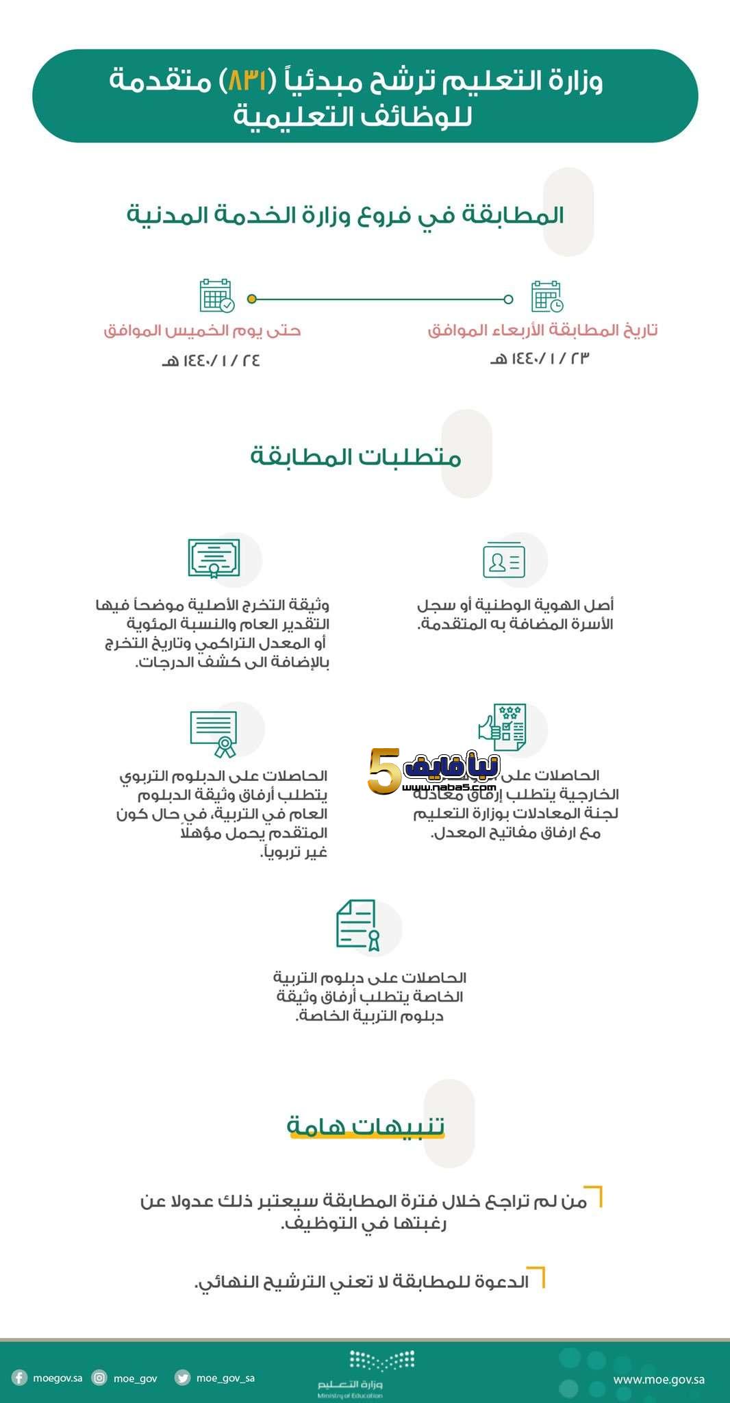 - يشترط أن تحضر المترشحات وثيقة اللجنة للمعادلات من وزارة التعليم وكذلك إرفاق مفاتيح المعدل.