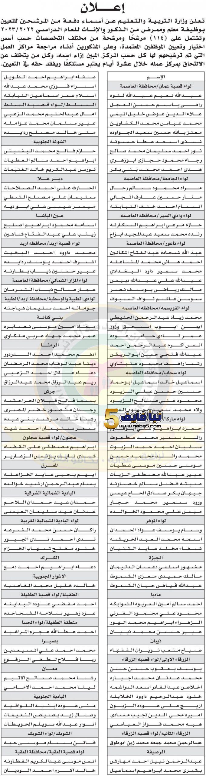 تم الأعلان من قبل وزارت التربية والتعليم عن استكمال إجراءات تعيين 114 مرشحا ومرشحة لوظائف معلم وممرض من الذكور والإناث، وذلك بالتنسيق مع ديوان الخدمة المدنية.