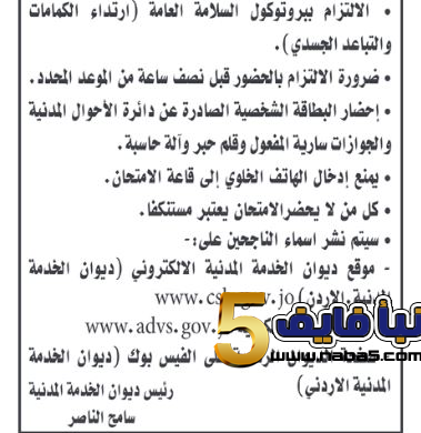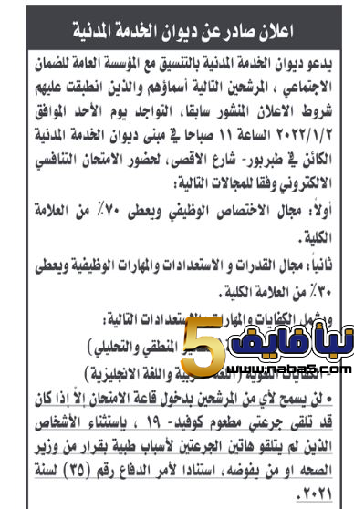 دعا ديوان الخدمة المدنية بالتنسيق مع المؤسسة العامة للضمان الاجتماعي، مرشحين لحضور الأمتحان التنافسي ويعقد ديوان الخدمة المدنية الامتحان التنافسي يوم الأحد الموافق 2 / 1 / 2022 الساعة 11 صباحاً.ويعقد ديوان الخدمة المدنية الامتحان التنافسي الالكتروني وفقا للمجالات التالي: أولا مجال الاختصاص الوظيفي ويعطي 70% من العلامة الكلية، ثانيا في مجال القدرات والاستعدادات والمهارات الوظيفية ويعطي 30 % من العلامة الكلية.