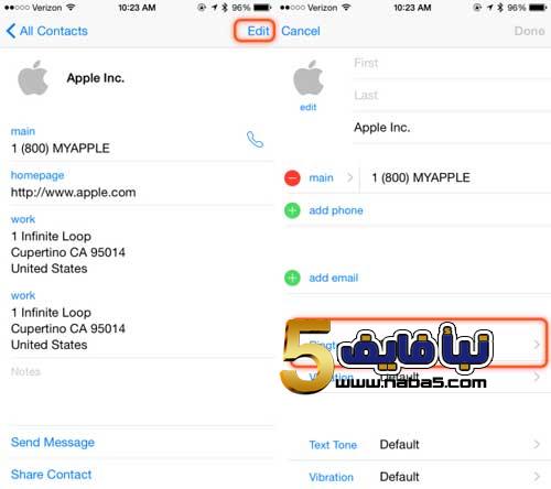 بعد أن تقوم بالدخول إلى جهات الاتصال وتحديد الشخص المراد وضع نغمة مخصصة له، قم بالضغط على تحرير أو edit، بعد ذلك قم بالنزول إلى أسفل القائمة واختيار نغمة الرنين ringtone.