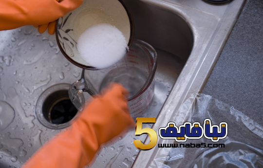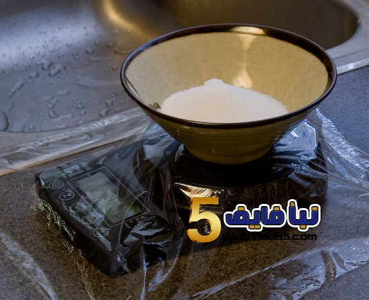 - بعد ذلك نقوم بصب الصودا الكاوية أو هيدروكسيد الصوديوم كما بالشكل التالي، ونستخدم الملعقة الخشبية لأن اي ملعقة اخرى سوف تتفاعل مع المكونات وهذا لا نريد الوصول إليه.
