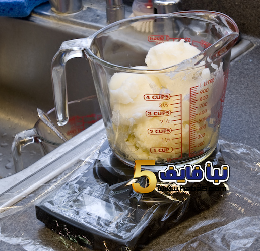 - نقوم بخلط المواد الدهنية المتوفرة لدينا في المكونات ونضعها في حمام مائي ساخن، من ثم نضعهم على النار ونتركهم حتى تمام الغليان، ثم ننقل المواد الدهنية في وعاء جديد ونحركهم ليتم التجانس.