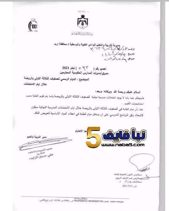 عمم مدير التربية والتعليم للواءي الطيبة والوسطية/ محافظة إربد على جميع مدارس التربية بعدم وجود امتحانات مدرسية نهائية للصفوف الثلاثة الأولى والروضة وإنما سيتم تقييم الطلبة حسب استراتيجات التقويم.وبحسب تعميم إطلعت صحيفة أخبار الأردن الإلكترونية على نصه فان دوام الطلبة في الصفوف الثلاثة الأولى والروضة خلال أيام الامتحانات المدررسية النهائية سيكون كالمعتاد وفق البرنامج المدرسي على أن يستغل دوام الطلبة في اعطاء المواد الأساسية لتعويض الفاقد التعليمي.